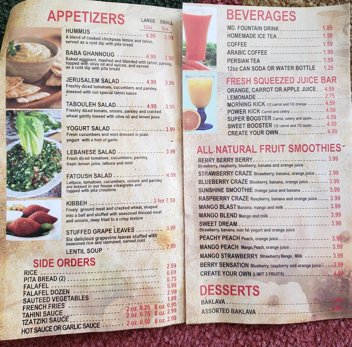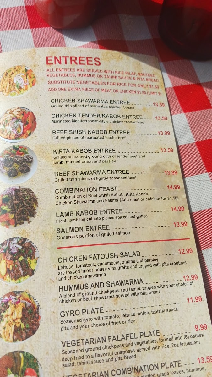 At Jerusalem Cafe, every meal tells a story. The highlight of the menu includes the Beef Shawarma Entrée, featuring grilled thin slices of gently seasoned beef, offered at just $12.59. This dish is complemented beautifully by the Beef Shish Kabob Entrée, where marinated pieces of tender beef are grilled to juicy perfection. For vegetarian patrons, the Vegetarian Sandwich is a delightful mix of fried vegetables, hummus, and Jerusalem salad, priced affordably at $6.59.