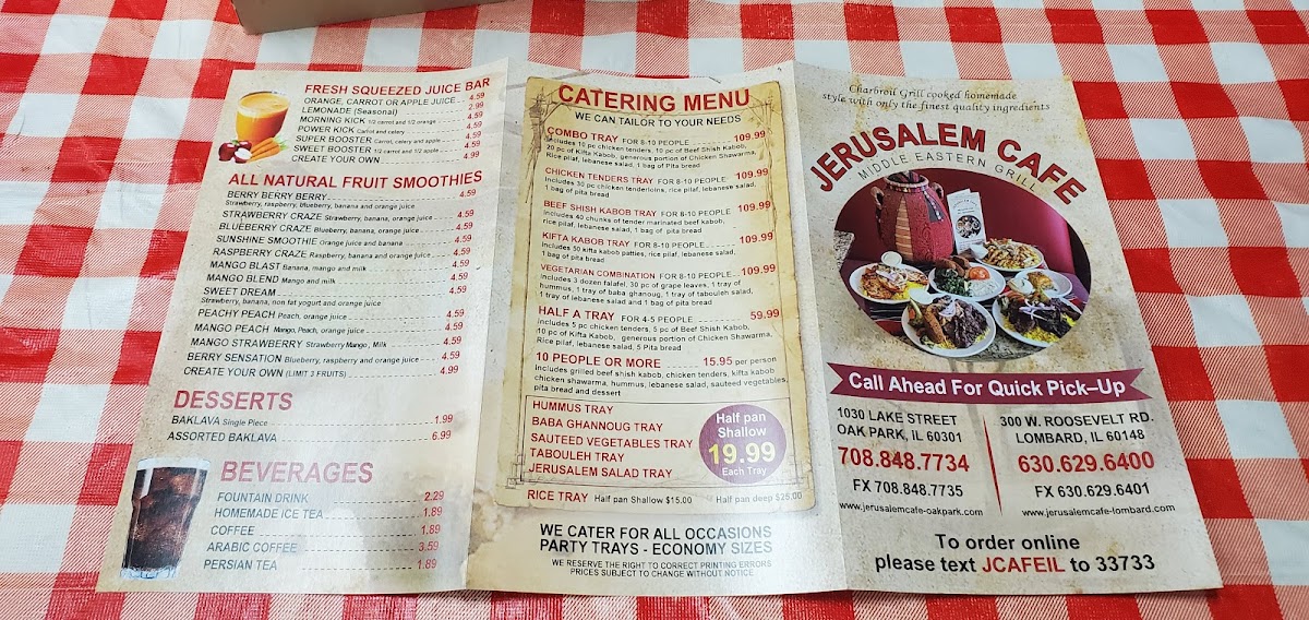 Welcome to Jerusalem Cafe - Restaurant and Grill - Lombard, a delightful gem nestled in Lombard, Illinois, at 300 W Roosevelt Rd. If you’re in search of authentic Middle Eastern cuisine that combines rich flavors with a warm, inviting atmosphere, this is the destination for you. With a menu that showcases a variety of delectable dishes, Jerusalem Cafe stands out for its commitment to quality and tradition.